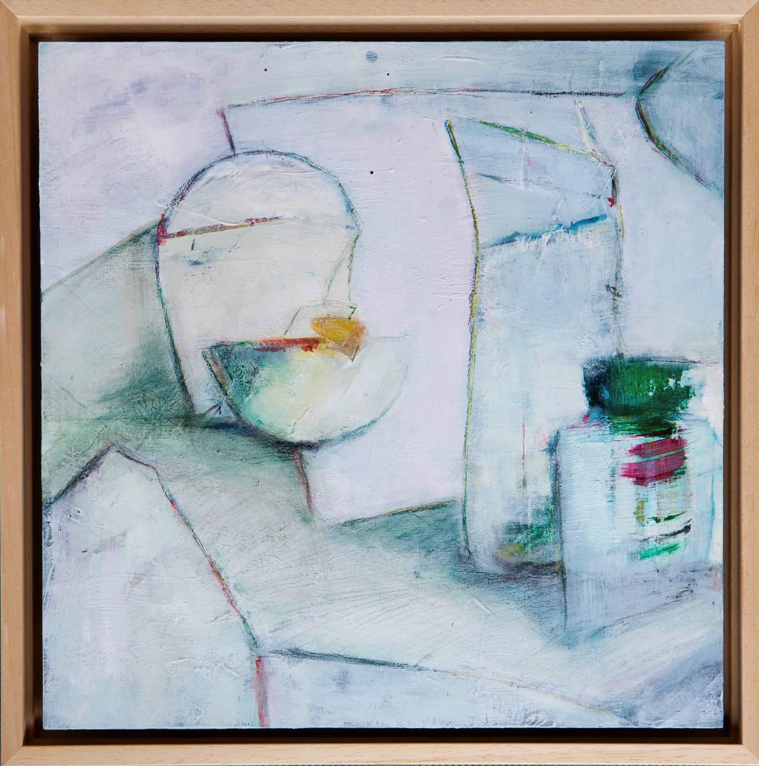 I love this piece because it gives a feeling of simplicity and cleanness. The whites give this painting a more fragile appearance. There are a lot of layers underneath in which I could find the shapes that ended up in this a little bit abstracted still life.