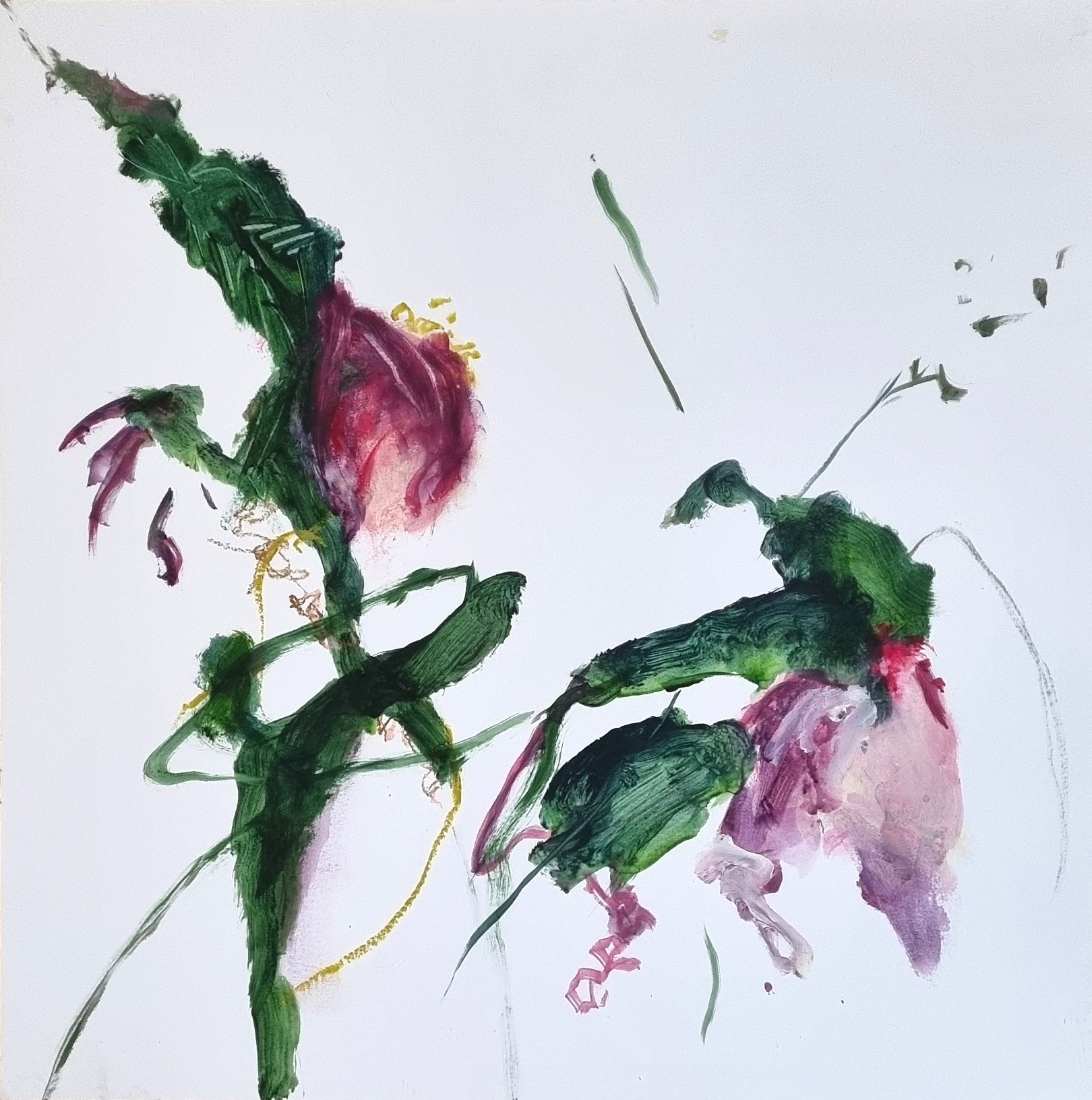 This is a minimalistic impression of some beautiful flowers. 'Tender Reach' explores the moment just before connection — when growth is hesitant, vulnerable, and alive with possibility. Rendered through minimal gestures and open space, the forms show flowers without fully defining them, allowing the viewer’s perception to complete the image. This way of painting needs restraint: marks are sparse, colors are limited, and the white ground is as active as the pigment itself.